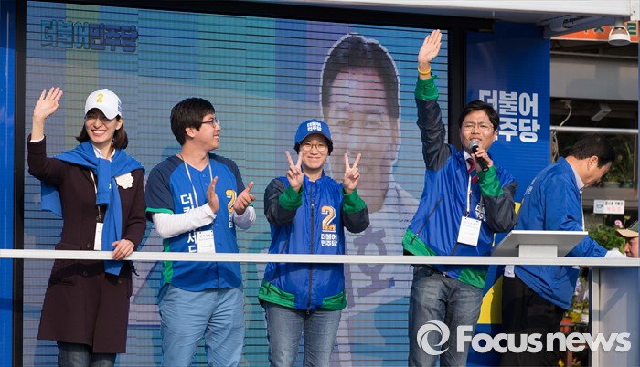 (서울=포커스뉴스) 5일 오후 서울 관악구 삼성동시장 앞에서 더컸유세단이 정태호 더불어민주당 관악구을 후보 지원유세를 하고 있다. 오른쪽부터 김광진 의원, 장하나 의원, 이동학 전 혁신의원, 김빈 전 청년 비례대표 후보.