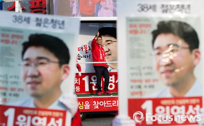 (서울=포커스뉴스) 5일 오후 서울 관악프라자센터 앞에서 원영섭 새누리당 관악구갑 후보가 선거유세를 하고 있다.