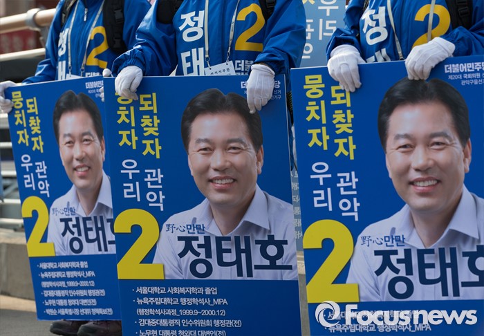 (서울=포커스뉴스) 5일 오후 서울 관악구 삼성동시장 앞에서 정태호 더불어민주당 관악구을 후보 선거운동원들이 지원유세를 하고 있다.