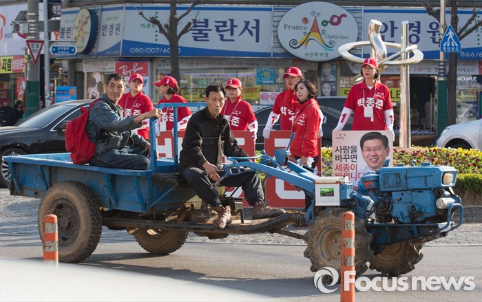 (세종=포커스뉴스) 5일 오후 세종시 조치원읍 조치원역 앞 교차로에서 경운기를 탄 시민들이 박종준 후보의 선거유세를 바라보고 있다.