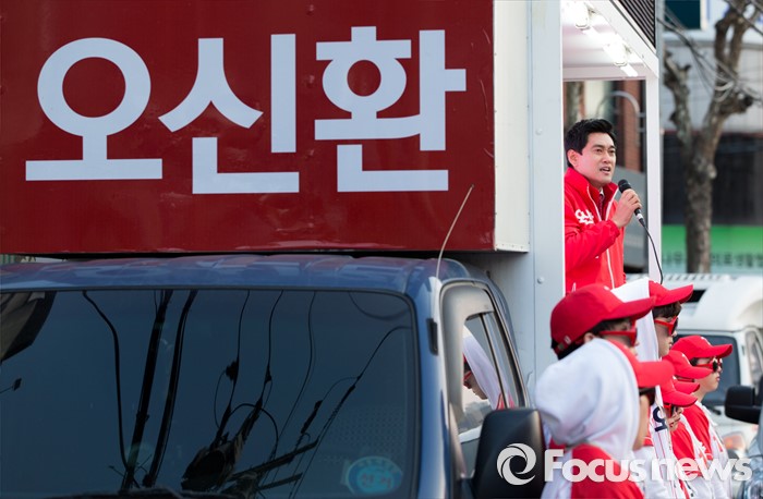 (서울=포커스뉴스) 5일 오후 서울 관악구 김한의원 앞에서 오신환 새누리당 관악구을 후보가 선거유세를 하고 있다.
