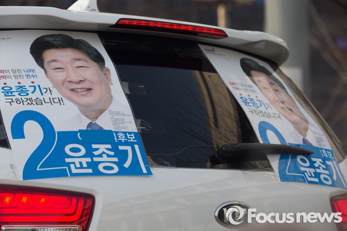 (인천=포커스뉴스) 5일 오후 인천 연수구 송도동 인근에서 윤종기 더불어민주당 연수을 후보 선거차량에 야권단일후보 명칭이 가려져 있다.