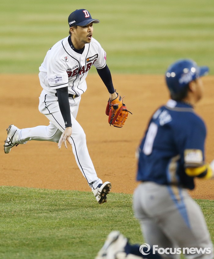 (서울=포커스뉴스) 5일 서울 잠실구장에서 열린 2016프로야구 NC-두산 경기 2회초 2사 1,2루에서 두산 2루수 오재원이 NC 박석민의 2루땅볼을 잡아 아웃시키고 있다.