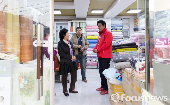 (서울=포커스뉴스) 5일 오후 서울 관악구 김한의원 앞에서 오신환 새누리당 관악구을 후보가 선거유세를 하고 있다.