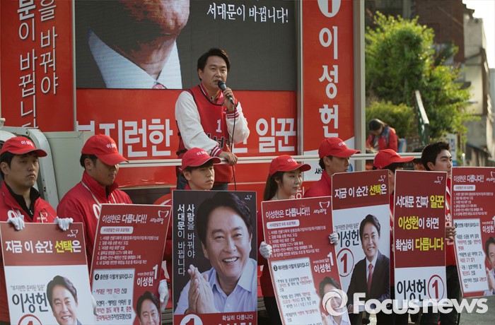 (서울=포커스뉴스) 5일 오후 서울 서대문구 충현동 인근에서 새누리당 서대문갑 이성헌 후보가 유세를 하고 있다.