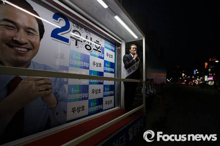 (서울=포커스뉴스) 5일 오후 서울 서대문구 아현역 인근에서 더불어민주당 우상호 서대문갑 후보가 시민들을 만나 유세를 하고 있다.