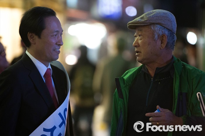 (서울=포커스뉴스) 5일 오후 서울 서대문구 아현역 인근에서 더불어민주당 우상호 서대문갑 후보가 시민들을 만나 유세를 하고 있다.