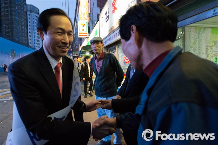 (서울=포커스뉴스) 5일 오후 서울 서대문구 아현역 인근에서 더불어민주당 우상호 서대문갑 후보가 시민들을 만나 유세를 하고 있다.