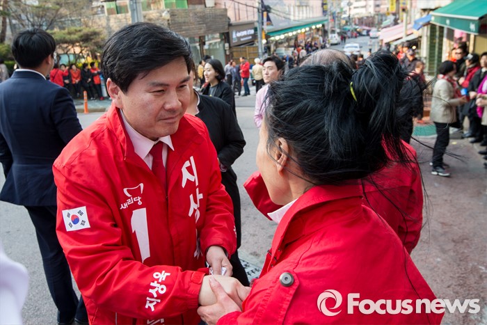 (서울=포커스뉴스) 5일 오후 서울 중구 약수시장 인근에서 지원유세를 가진 지상욱 새누리당 중구성동구을 후보가 유권자들과 악수하고 있다.