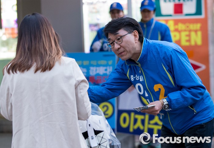 (서울=포커스뉴스) 5일 오후 서울 중구 신당역 인근에서 선거유세에 나선 이지수 더불어민주당 중구성동구을 후보가 퇴근길의 유권자에게 지지를 호소하고 있다.