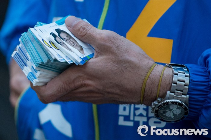 (서울=포커스뉴스) 5일 오후 서울 중구 신당역 인근에서 선거유세에 나선 이지수 더불어민주당 중구성동구을 후보가 명함을 들고 퇴근길의 유권자들을 기다리고 있다.