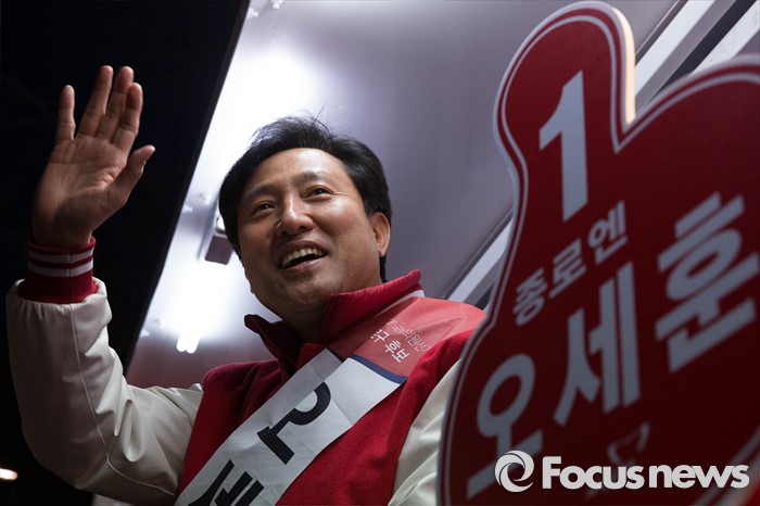 (서울=포커스뉴스) 20대 총선을 8일 앞둔 5일 오후 서울 종로구 통인시장 일대에서 오세훈 새누리당 종로구 후보가 퇴근길 선거유세를 하고 있다.