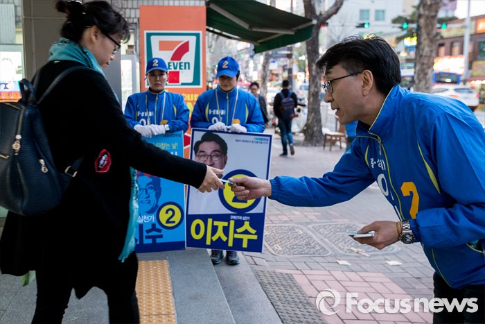(서울=포커스뉴스) 5일 오후 서울 중구 신당역 인근에서 선거유세에 나선 이지수 더불어민주당 중구성동구을 후보가 퇴근길의 유권자에게 지지를 호소하고 있다.
