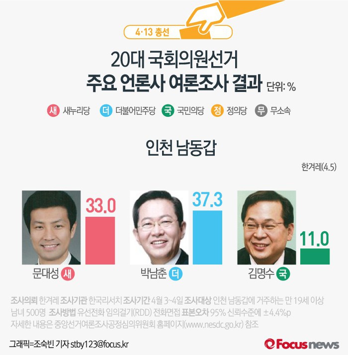 (서울=포커스뉴스) 한겨레가 여론조사기관 한국리서치에 의뢰해 5일 발표한 결과에 따르면 인천 남동갑의 지지율은 더민주 박남춘 후보(37.3%), 새누리당 문대성 후보(33.0%), 국민의당 김명수 후보(11.0%) 순인 것으로 나타났다.