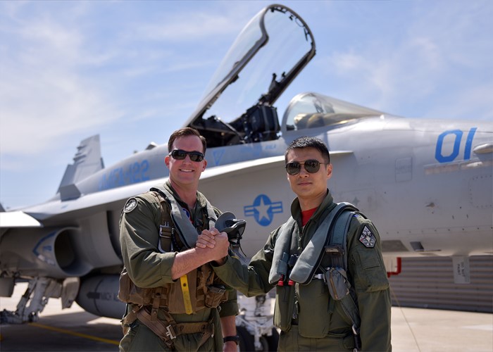 (서울=포커스뉴스) 5일 제16전투비행단 FA-50 전투기와 미 해병대 1항공단 제12비행전대 F/A-18C 전투기 조종사들이 연합비행 훈련에 앞서 기념촬영을 하고 있다. 사진 왼쪽은 미 해병 12비행전대 F/A-18C 조종사 프레드릭 갤럽과 16전비 202비행대대 FA-50 전투기 조종사 차명수 소령. <사진제공=공군>