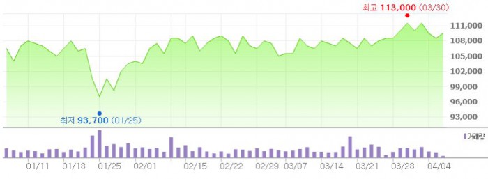 그는 "해외 담배 매출액도 32.5% 증가한 2203억원이 예상되며 홍삼부분 매출액도 2651억원을 기록할 전망"이라고 내다봤다.최근 3개월간 KT&G 주가 추이 <그래픽출처=네이버>