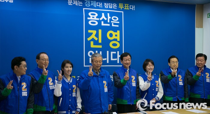 (서울=포커스뉴스) 6일 오전 진영 더불어민주당 서울 용산구 후보 선거사무소에서 열린 중앙선거대책위원회의에 참석한 김종인 비대위 대표 겸 선대위원장 등 참석자들이 취재진을 향해 포즈를 취하고 있다. 왼쪽부터 전병헌 부위원장, 최운열, 박경미 비례대표 후보, 김 대표, 진 후보, 이재정 비례대표 후보, 송현섭, 이근식 부위원장.