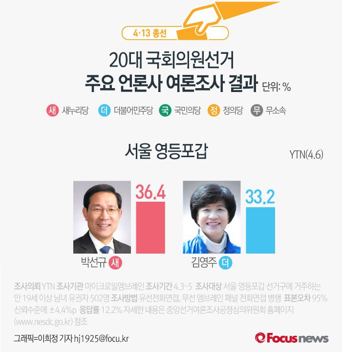 (서울=포커스뉴스) YTN이 마이크로밀엠브레인에 의뢰해 6일 발표한 여론조사 결과에 따르면 새누리당 박선규 후보의 지지율은 36.4%, 더불어민주당 김영주 후보는 33.2%를 기록했다.