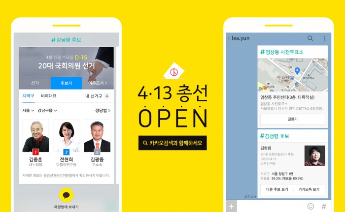이 외에도 카카오는 SBS와의 협약을 통해 SBS로부터 투·개표 데이터, 선거 방송 영상 등을 제공받아 이용자들에게 보다 풍성한 총선 정보를 서비스한다는 방침이다.카카오 총선 검색 <사진제공=카카오> 2016.03.29 지봉철 기자