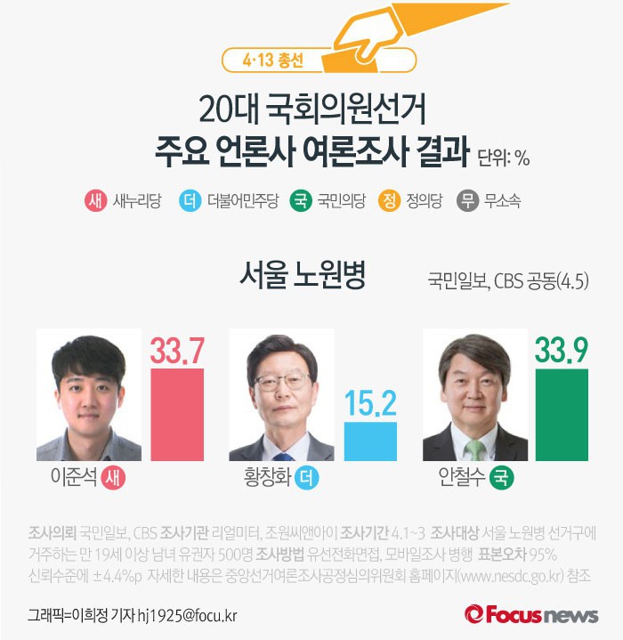 (서울=포커스뉴스) 국민일보, CBS가 리얼미터, 조원씨앤아이에 의뢰해 5일 발표한 여론조사 결과에 따르면 새누리당 이준석 후보의 지지율은 33.7%, 국민의당 안철수 후보는 33.9%로 나타났다. 더불어민주당 황창화 후보의 지지율은 15.2%를 기록했다.