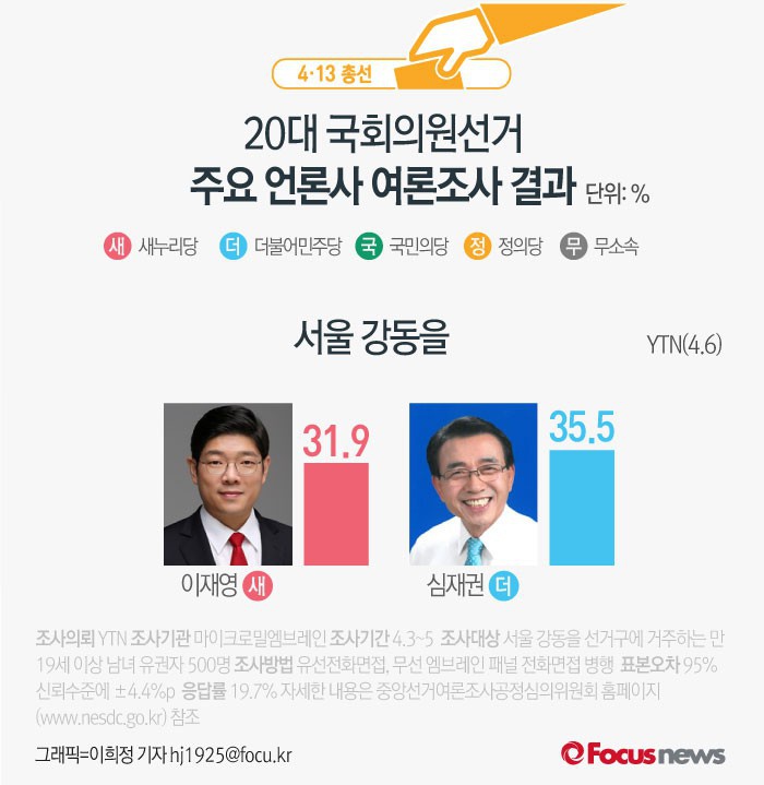 (서울=포커스뉴스) YTN이 마이크로밀엠브레인에 의뢰해 6일 발표한 여론조사 결과에 따르면 새누리당 이재영 후보의 지지율은 31.9%, 더불어민주당 심재권 후보는 35.5%를 기록했다.