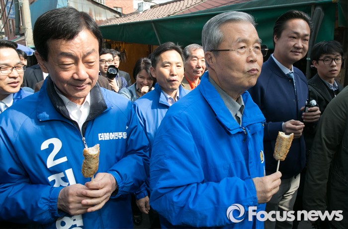 (서울=포커스뉴스) 김종인(오른쪽) 더불어민주당 비대위 대표 겸 선대위원장과 진영 서울 용산구 후보가 6일 오전 용문시장을 방문해 어묵을 맛보며 이동하고 있다.