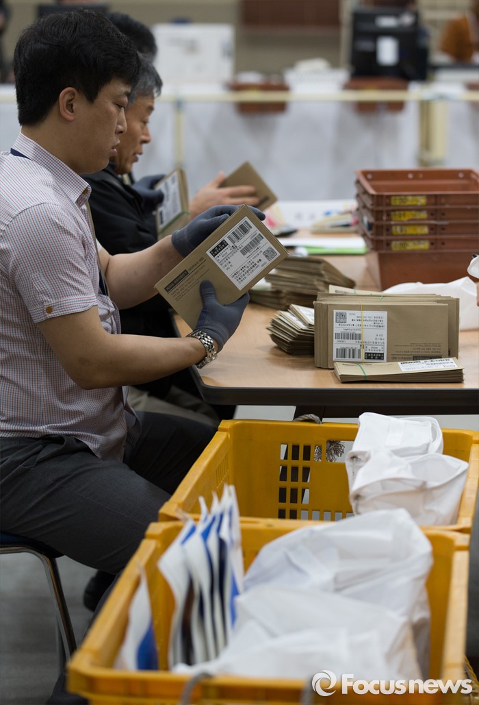 (인천=포커스뉴스) 제20대 국회의원선거 재외투표 우편물 접수 시작일인 6일 오전 인천 중구 국제우편물류센터에서 직원들이 재외투표 회송 우편물을 분류하고 있다.
