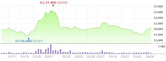 회사 관계자는 "현재 이 기술은 자궁경부암 원인균 판별이 가능한 DNA칩 'HDHPView'에 응용돼 해외 여러 업체와 수출이 논의되고 있으며 국내 판매도 계획 중"이라고 설명했다.최근 3개월간 랩지노믹스 주가 추이 <그래픽출처=네이버>