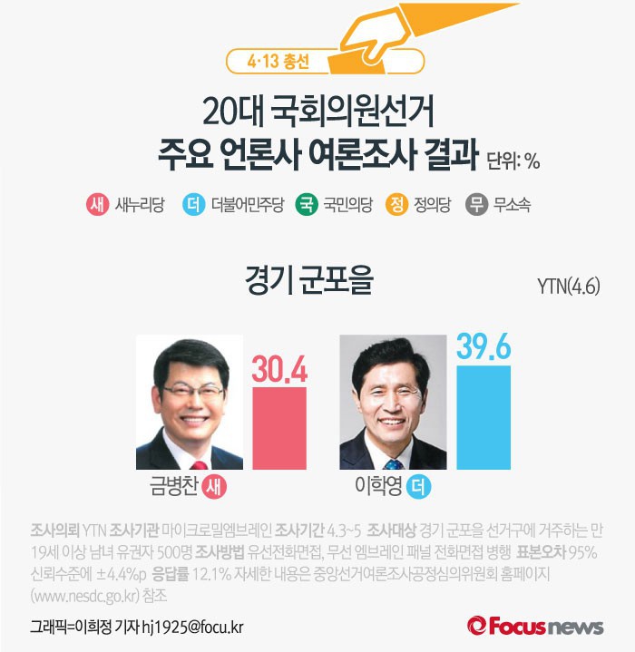 (서울=포커스뉴스) YTN이 마이크로밀엠브레인에 의뢰해 6일 발표한 여론조사 결과에 따르면 새누리당 금병찬 후보의 지지율은 30.4%, 더불어민주당 이학영 후보는 39.6%를 기록했다.
