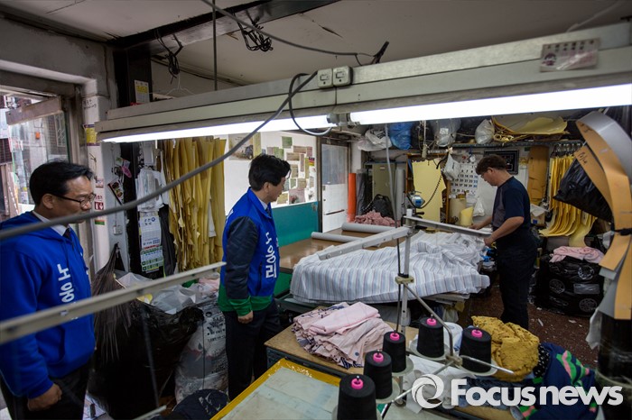 (서울=포커스뉴스) 노웅래 더불어민주당 마포구갑 후보가 6일 오전 서울 마포구 봉제공장을 찾아 선거운동을 하고 있다.