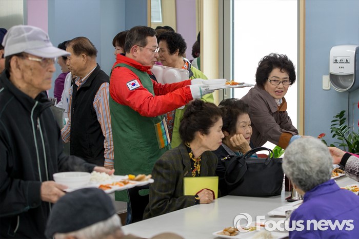 (서울=포커스뉴스) 안대희 새누리당 마포구갑 후보가 6일 오전 서울 마포구 용강노인복지회관에서 배식봉사를 하고 있다.