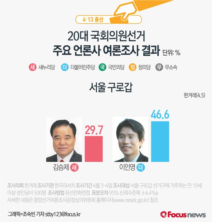 (서울=포커스뉴스) 한겨레가 여론조사기관 한국리서치에 의뢰해 5일 발표한 결과에 따르면 서울 구로갑에서 새누리당 김승제 후보의 지지율은 29.7%, 더민주 이인영 후보의 지지율은 46.6%인 것으로 나타났다.