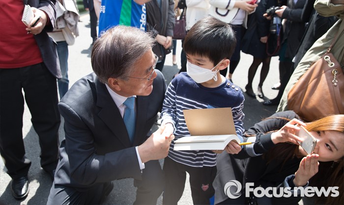 (용인=포커스뉴스) 6일 오전 경기 용인 기흥구 보정동 카페거리에서 문재인 더불어민주당 전 대표가 표창원 더민주 용인시정 후보 지원유세를 하고 있다.