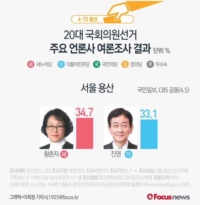 (서울=포커스뉴스) 국민일보와 CBS가 여론조사기관 리얼미터와 조원씨앤아이에 의뢰해 5일 발표한 결과에 따르면 서울 용산에서 새누리당 황춘자 후보의 지지율은 34.7%, 더불어민주당 진영 후보의 지지율은 33.1%인 것으로 나타났다.