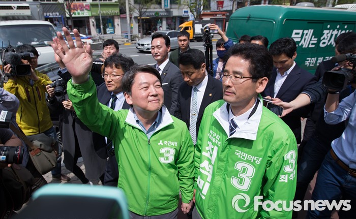 (대구=포커스뉴스) 안철수 국민의당 상임공동대표가 6일 오후 대구광역시 북구 경북대학교 앞에서 최석민 대구 북구갑 후보 지원유세를 하고 있다.