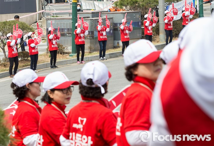(당진=포커스뉴스) 6일 오후 충남 당진 구 버스터미널 사거리에서 열린 김무성 새누리당 대표, 김동완 당진시 후보 지원유세장에서 선거 사무원들이 유권자들의 지지를 호소하고 있다.