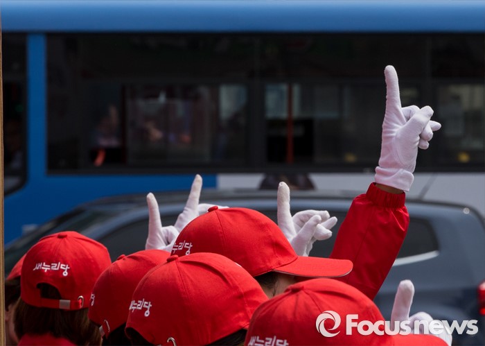 (당진=포커스뉴스) 6일 오후 충남 당진 구 버스터미널 사거리에서 열린 김무성 새누리당 대표, 김동완 당진시 후보 지원유세장에서 선거 사무원들이 유권자들의 지지를 호소하고 있다.