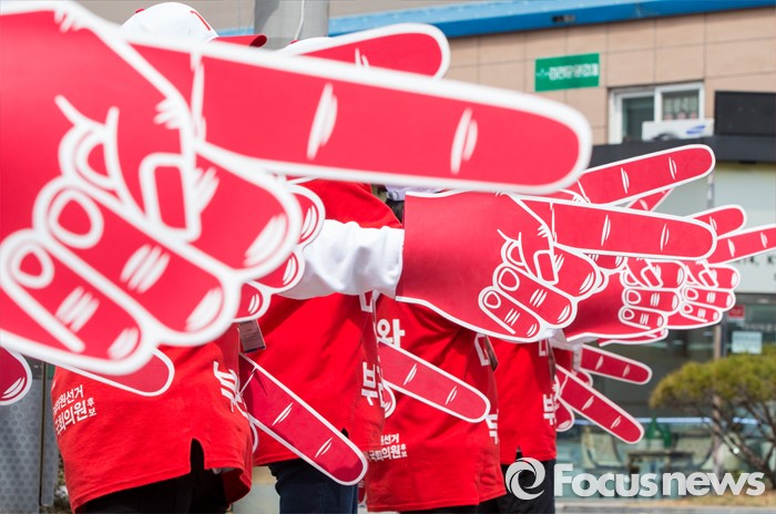 (당진=포커스뉴스) 6일 오후 충남 당진 구 버스터미널 사거리에서 열린 김무성 새누리당 대표, 김동완 당진시 후보 지원유세장에서 선거 사무원들이 유권자들의 지지를 호소하고 있다.