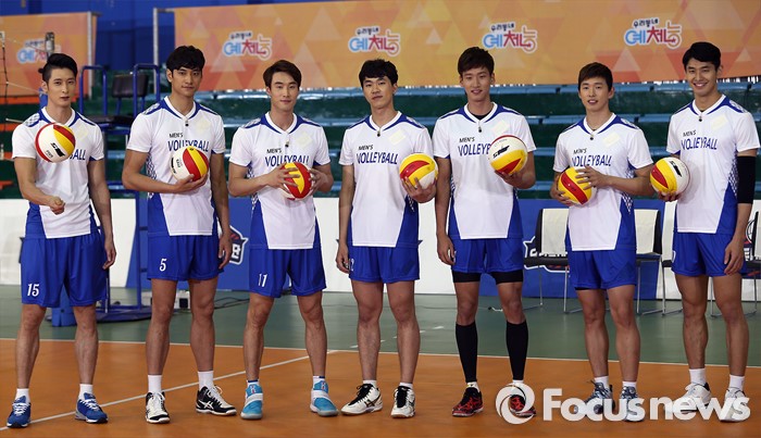 (서울=포커스뉴스) 6일 오후 서울 강서구 KBS스포츠월드에서 열린 예능프로그램 '우리동네 예체능' 촬영현장 공개 행사에 참여한 출연진들이 포토타임을 갖고 있다. 왼쪽부터 배구선수 문성민, 김요한, 최홍석, 전광인, 송명근, 한선수, 지태환.