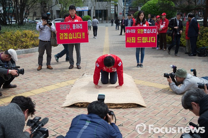 (대구=포커스뉴스) 김문수 새누리당 수성구갑 후보가 6일 오후 대구광역시 수성구 범어네거리에서 새누리당 공천 잘못과 대구 경제 못 살린것을 사죄한다며 절을 하고 있다.