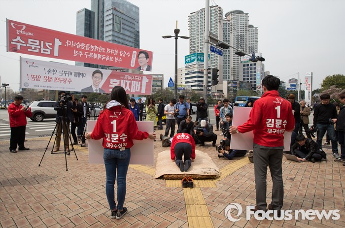 (대구=포커스뉴스) 김문수 새누리당 수성구갑 후보가 6일 오후 대구광역시 수성구 범어네거리에서 새누리당 공천 잘못과 대구 경제 못 살린것을 사죄한다며 절을 하고 있다.