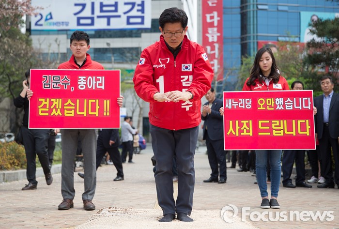 (대구=포커스뉴스) 김문수 새누리당 수성구갑 후보가 6일 오후 대구광역시 수성구 범어네거리에서 새누리당 공천 잘못과 대구 경제 못 살린것을 사죄한다며 절을 하고 있다.