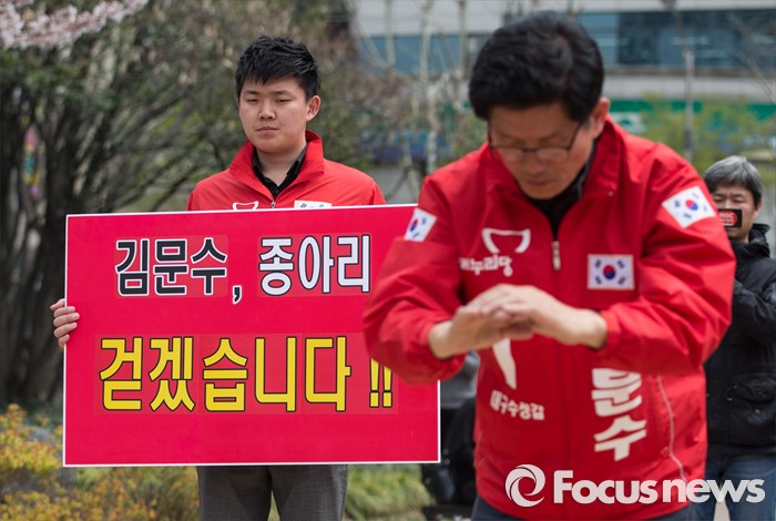 (대구=포커스뉴스) 김문수 새누리당 수성구갑 후보가 6일 오후 대구광역시 수성구 범어네거리에서 새누리당 공천 잘못과 대구 경제 못 살린것을 사죄한다며 절을 하고 있다.