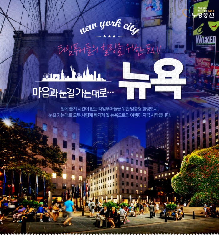 뉴욕까지 직항으로 운행하는 유나이티드항공과 아시아나항공을 왕복 이용하는 이번 상품은 최저 145만원부터 판매되며 항공권과 호텔 가격이 포함되어 있다.