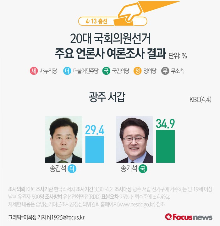 (서울=포커스뉴스) KBC가 한국리서치에 의뢰해 4일 발표한 광주 서갑 여론조사 결과에 따르면 더불어민주당 송갑석 후보의 지지율은 29.4%, 국민의당 송기석 후보는 34.9%를 기록했다.