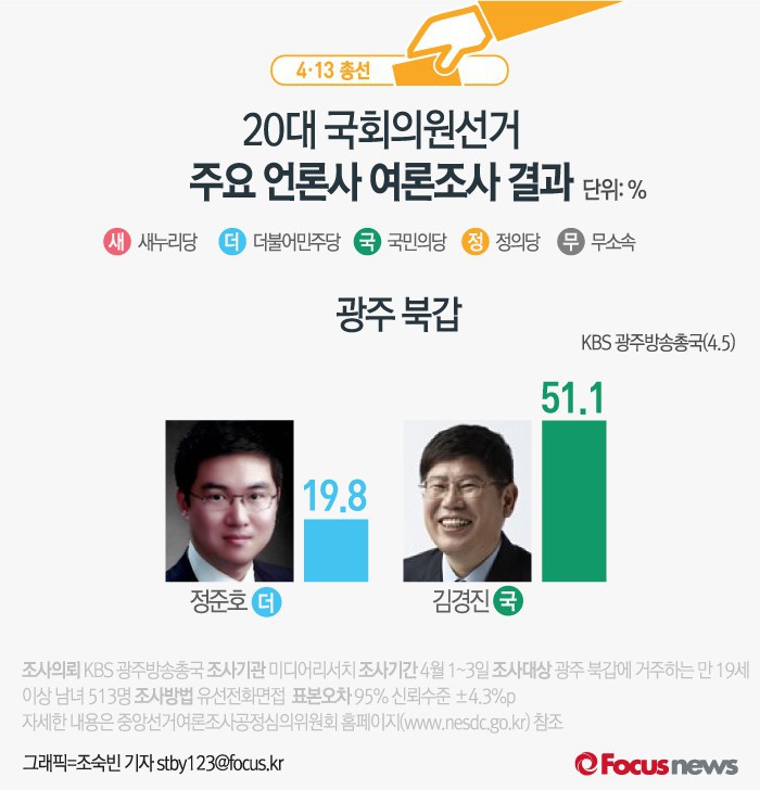 (서울=포커스뉴스) KBS광주방송총국이 미디어리서치에 의뢰해 5일 발표한 결과에 따르면 광주 북갑에서 더민주 정준호 후보의 지지율은 19.8%, 국민의당 김경진 후보의 지지율은 51.1%인 것으로 나타났다.