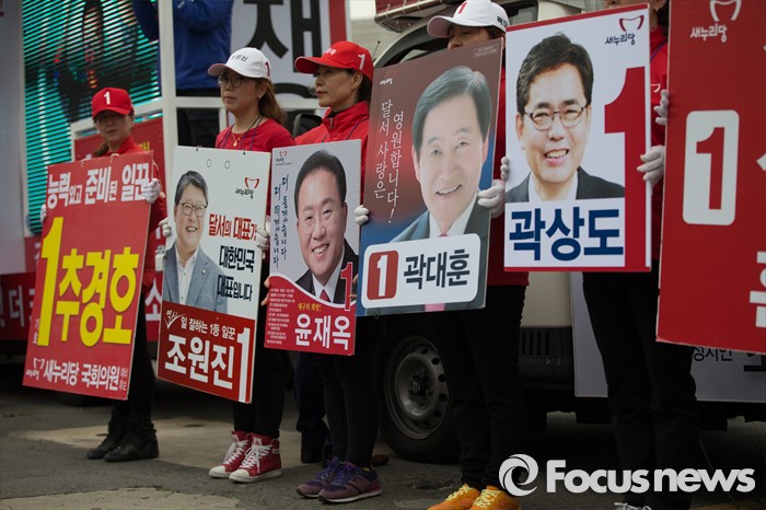 (대구=포커스뉴스) 새누리당 선거운동원들이 6일 오후 대구광역시 달서구 성당동 일대에서 대구지역 후보자 총집결 거리유세를 하고 있다.