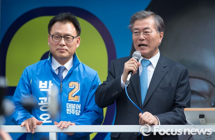 (수원=포커스뉴스) 6일 오후 경기 수원시 영통구 매탄1동 주민센터 앞에서 문재인 더불어민주당 전 대표가 박광온 더민주 수원시정 후보 지원유세를 하고 있다.