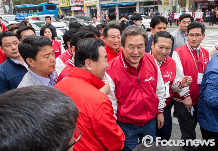 (천안=포커스뉴스) 6일 오후 충남 천안 두정로에서 최민기 새누리당 천안시을 후보 지원유세에 나선 김무성 대표가 유세차로 향하고 있다.