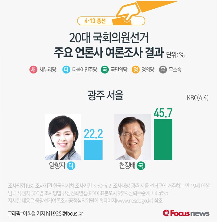 (서울=포커스뉴스) KBC가 한국리서치에 의뢰해 4일 발표한 광주 서을 여론조사 결과에 따르면 더불어민주당 양향자 후보의 지지율은 22.2%, 국민의당 천정배 후보는 45.7%를 기록했다.